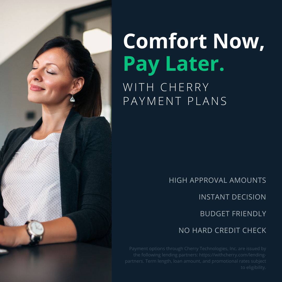 - No insurance? No problem. We offer flexible monthly financing through Cherry, so you can get the care you need — without the financial stress.